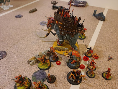 The gobber tinker loots his house, and the gobber repair crew loots theirs, much to the frustration of the dire wolf who'd nearly destroyed that house. Now Cygnar has looted three buildings and Khador has destroyed three.
